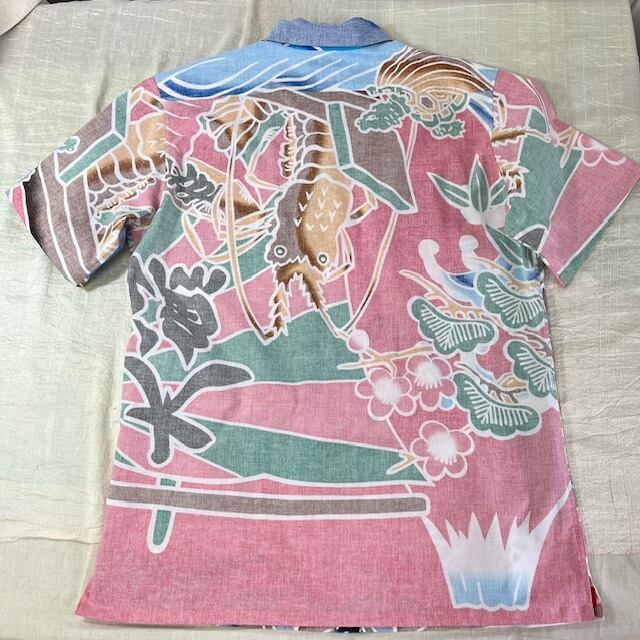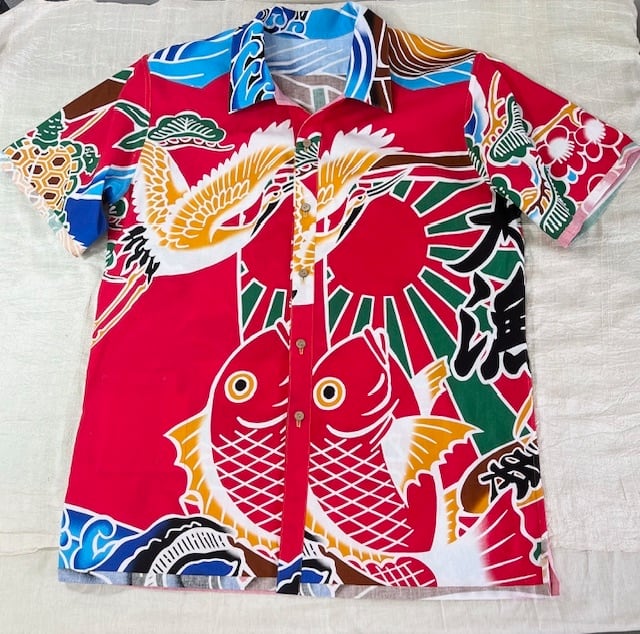 鮮やかなカラフルさで周囲の視線を惹きつける「大漁リバーシブルアロハ」は、大漁旗柄生地を使用したアロハシャツです。