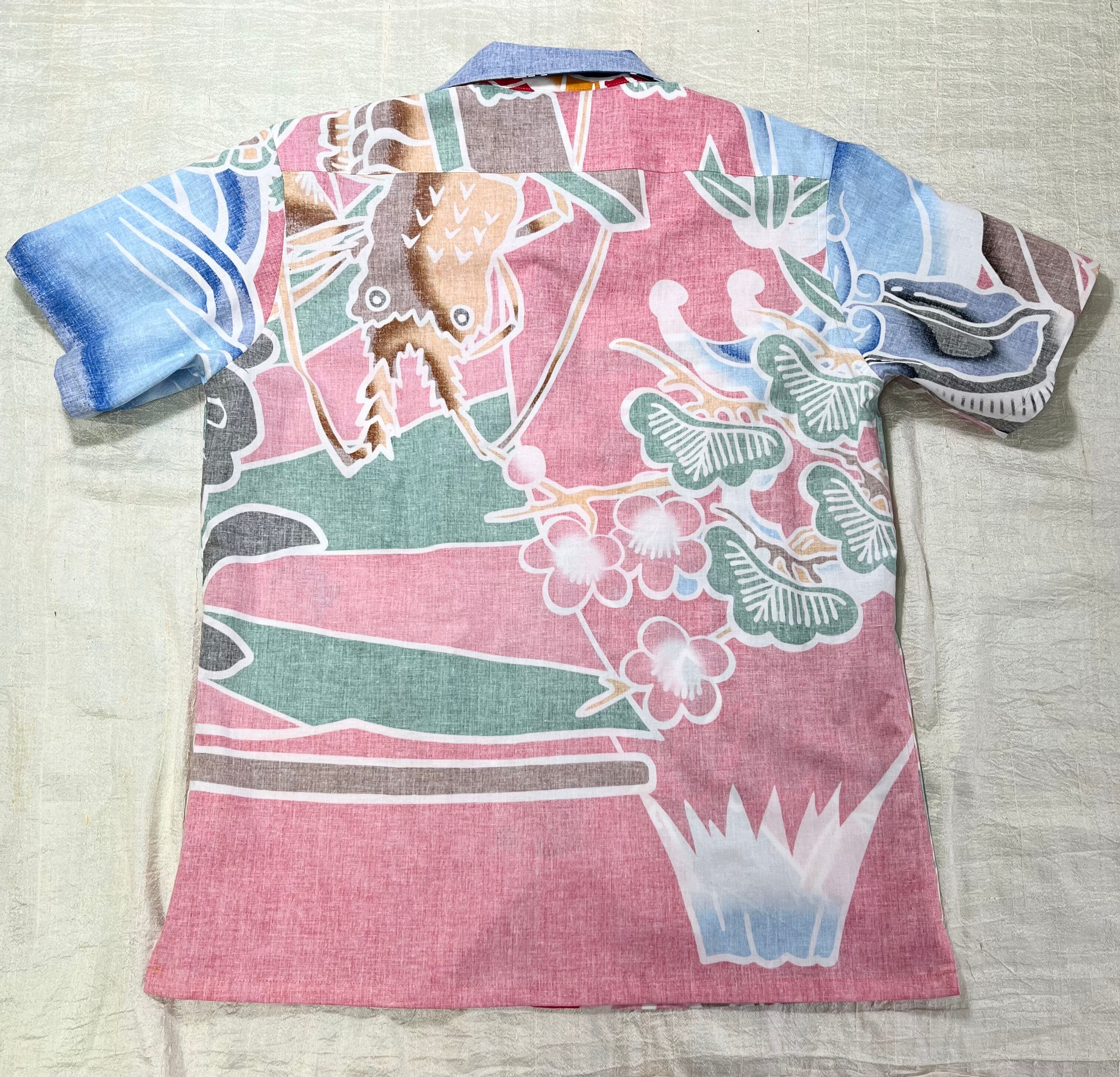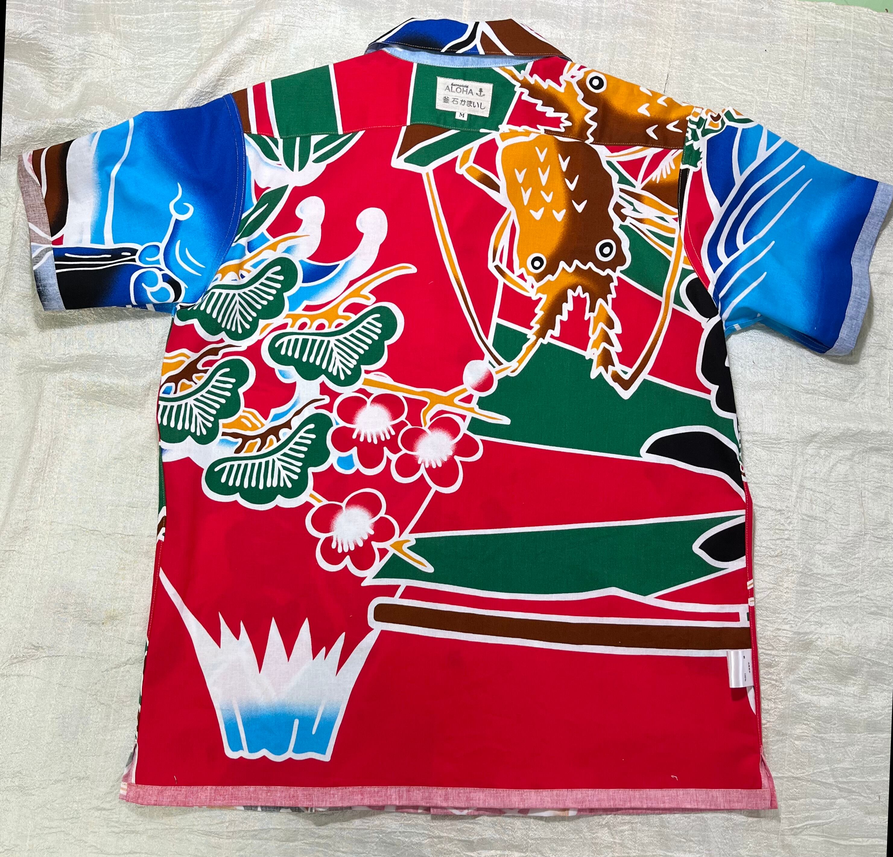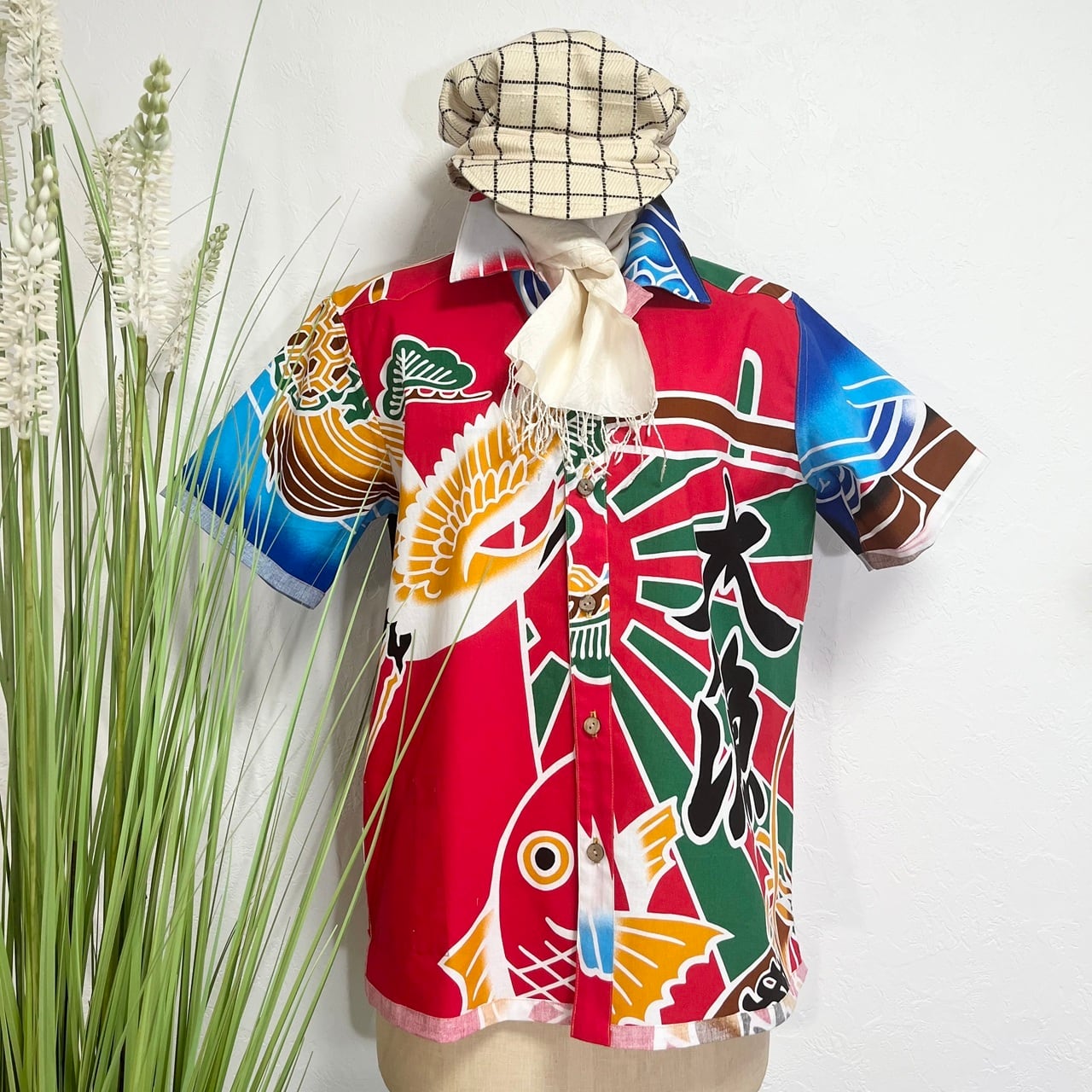 鮮やかなカラフルさで周囲の視線を惹きつける「大漁リバーシブルアロハ」は、大漁旗柄生地を使用したアロハシャツです。