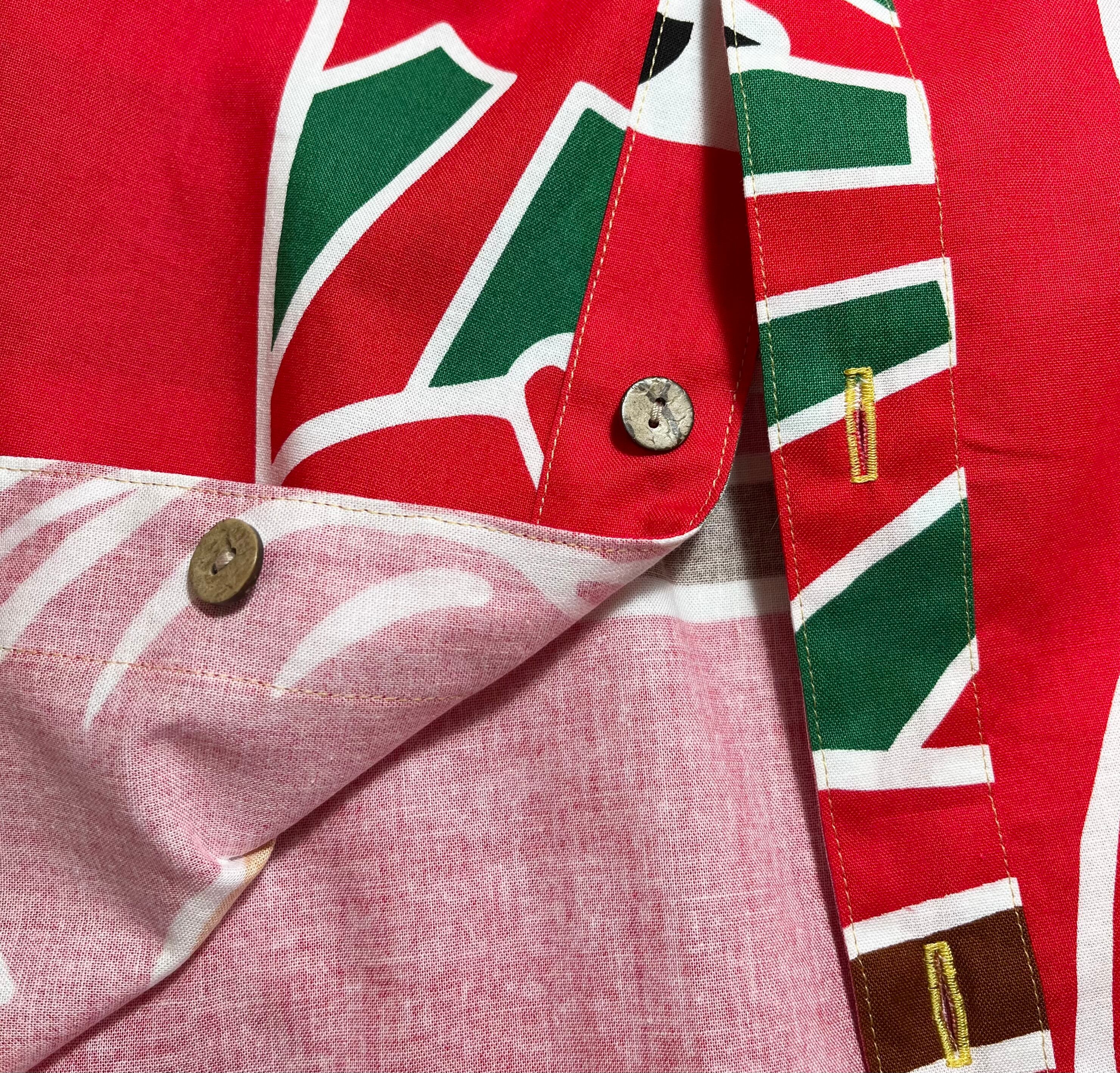 生地の裏を使ったのがリバーシブルアロハの「オモテ」です。ボタンが両面についているので右前も左前も自由、オモテもウラも「表」で両面着られて男女も選びません。変わり型の前ヨーク、両面ボタンはアロハの定番のココナツボタン、前身ごろの柄が隠れない位置でペンも入る腰ポケットなど、こだわりディティールいっぱい、カジュアルシーンにぴったり合う一着です。