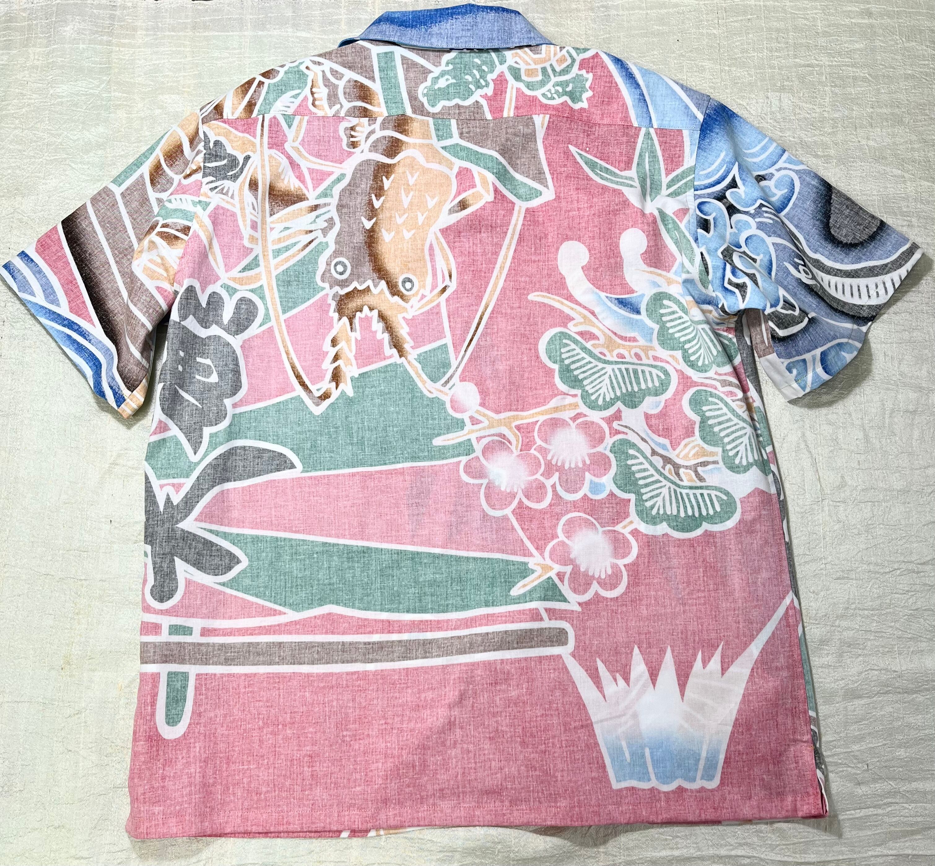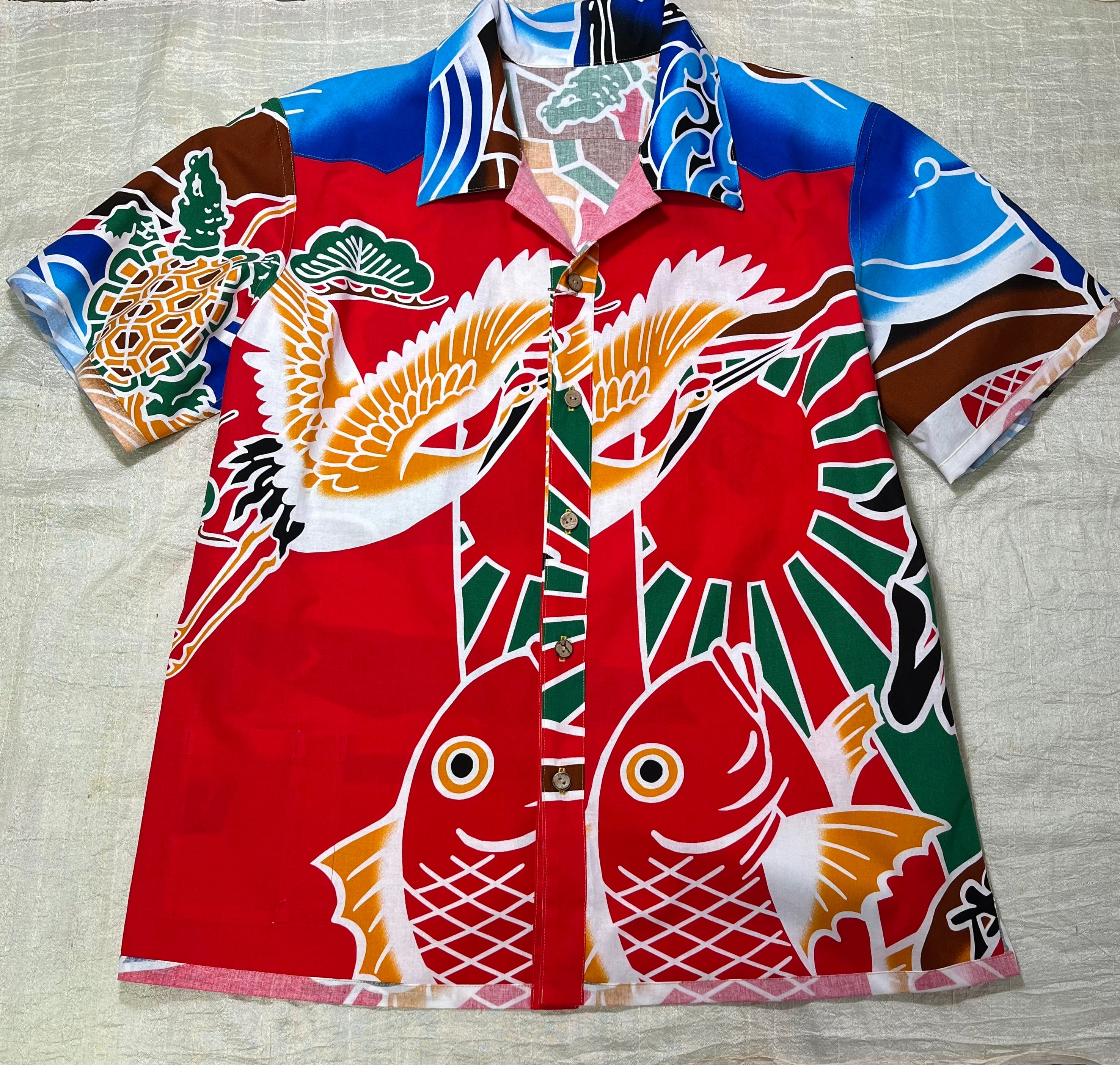 鮮やかなカラフルさで周囲の視線を惹きつける「大漁リバーシブルアロハ」は、大漁旗柄生地を使用したアロハシャツです。
