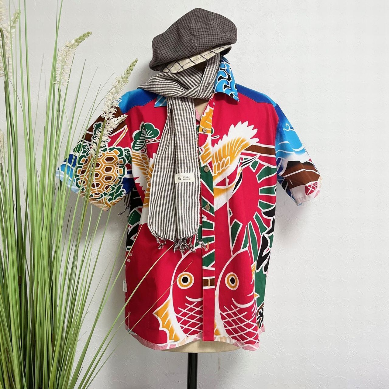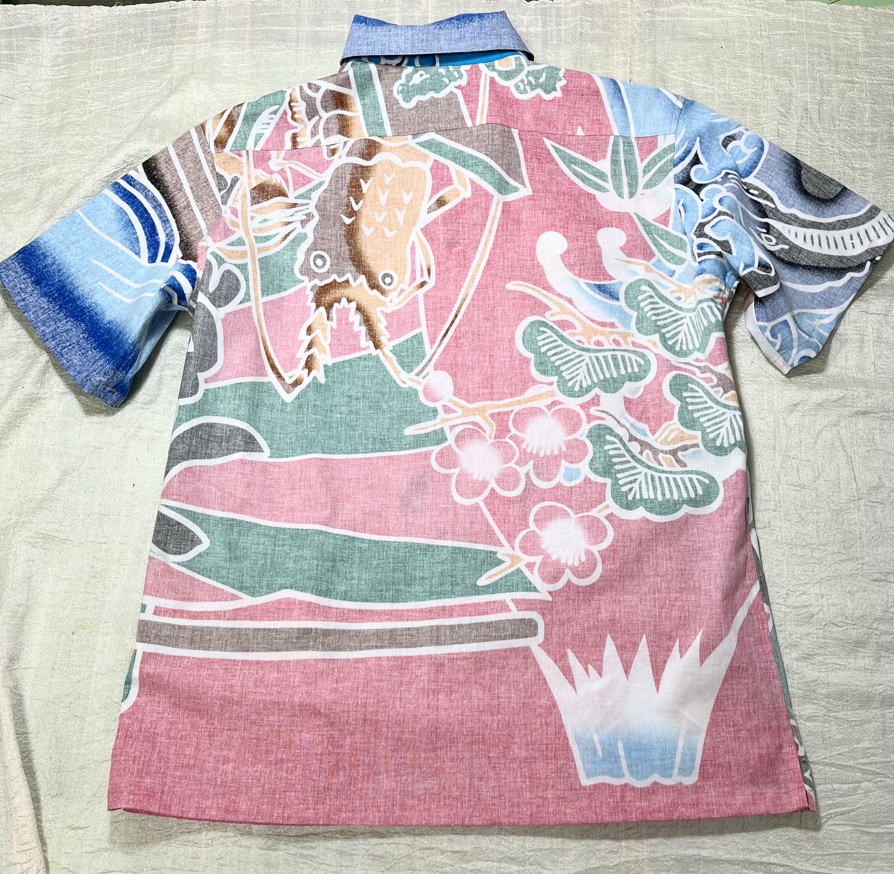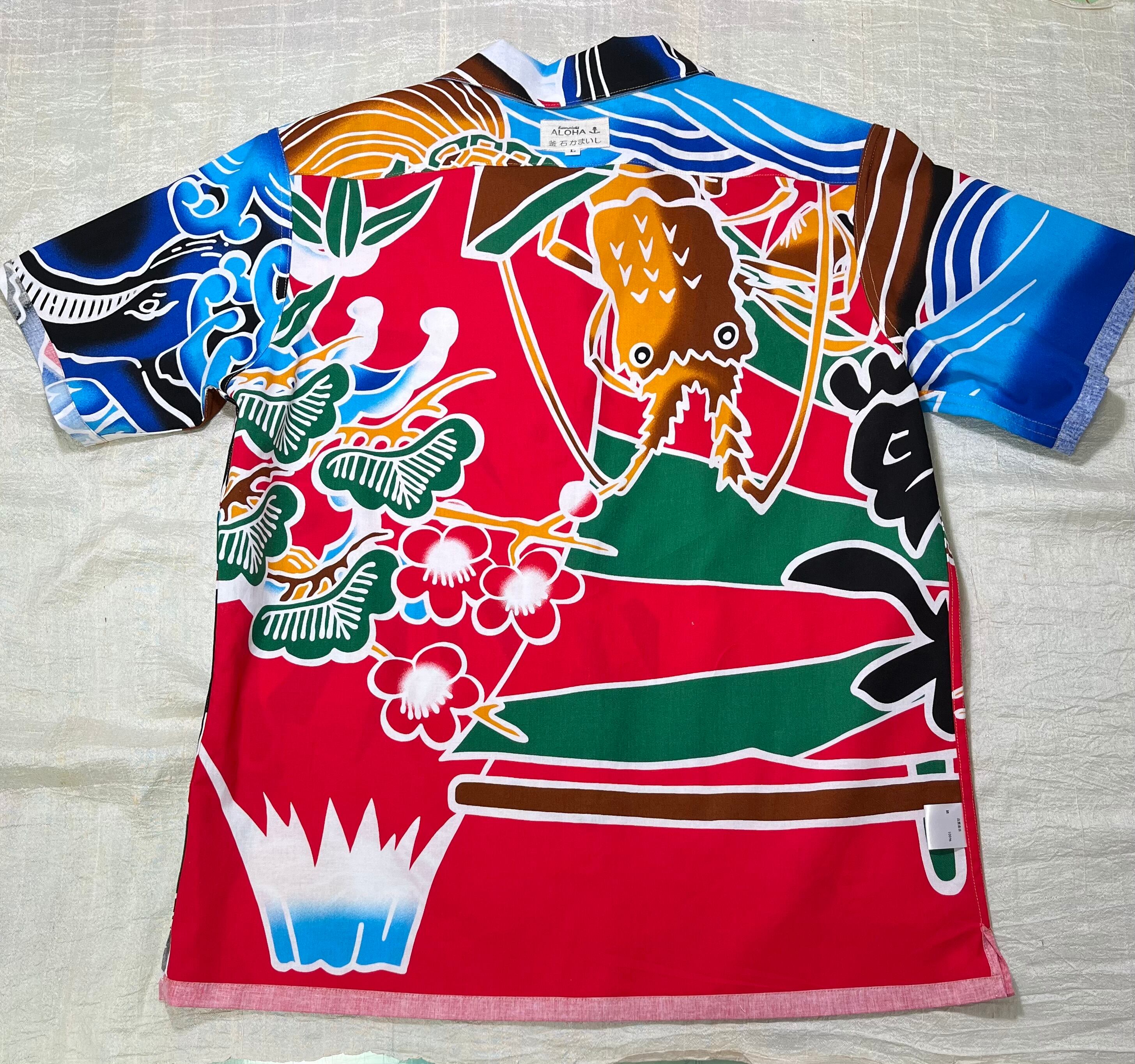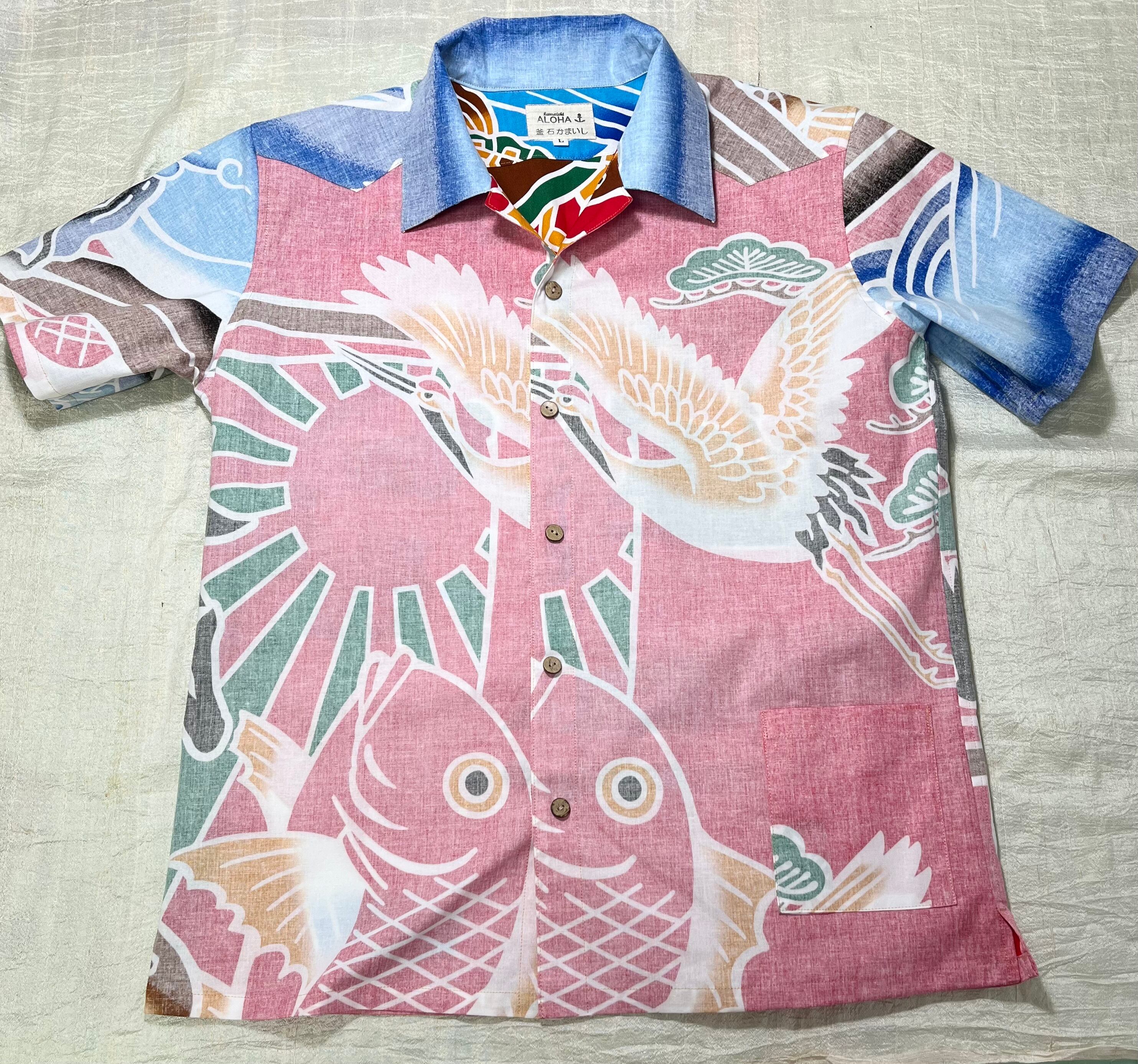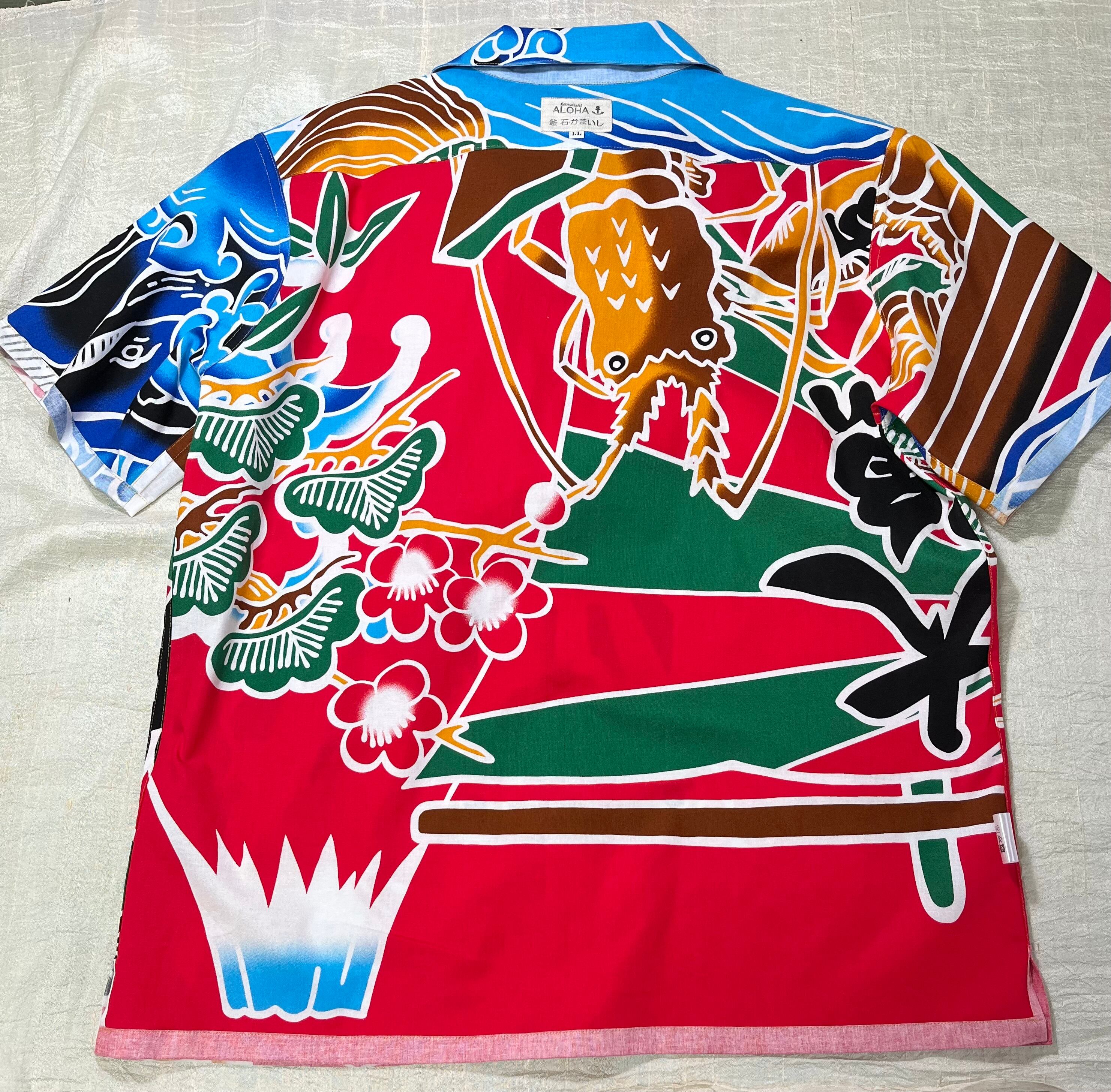 鮮やかなカラフルさで周囲の視線を惹きつける「大漁リバーシブルアロハ」は、大漁旗柄生地を使用したアロハシャツです。