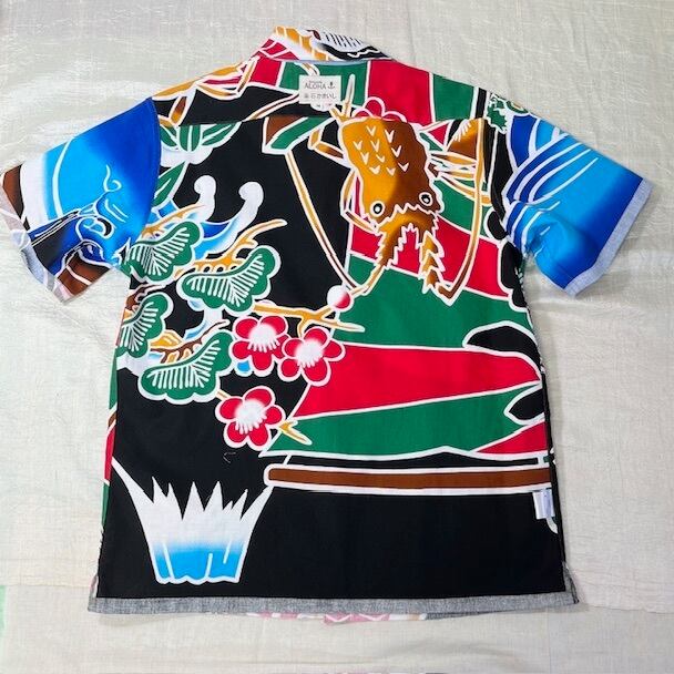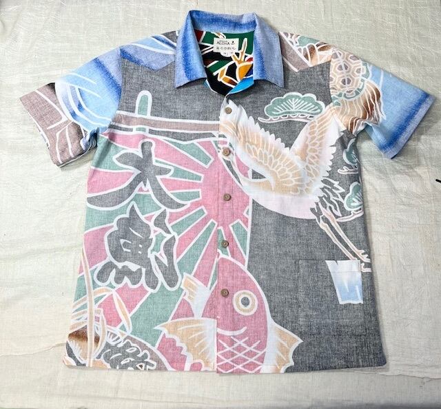 鮮やかなカラフルさで周囲の視線を惹きつける「大漁リバーシブルアロハ」は、大漁旗柄生地を使用したアロハシャツです。