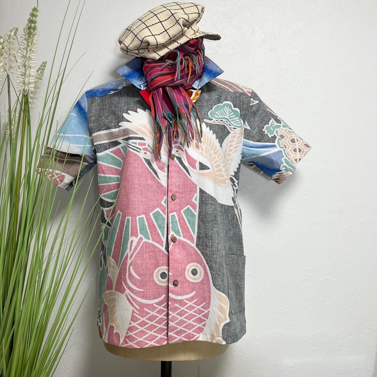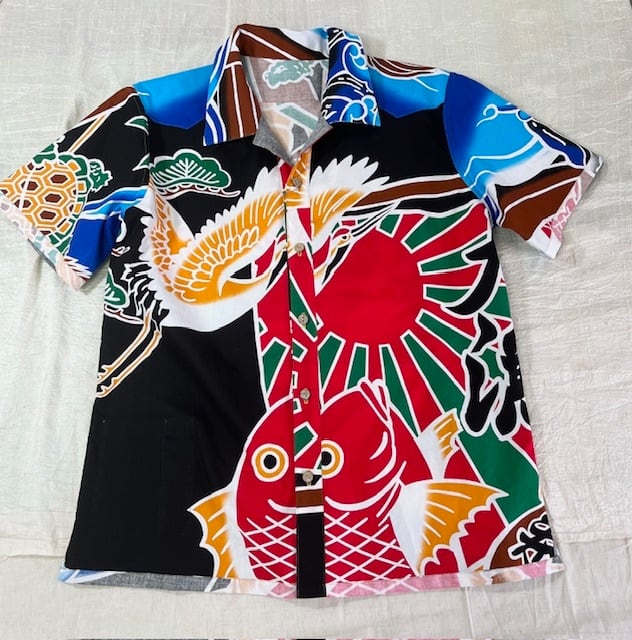 鮮やかなカラフルさで周囲の視線を惹きつける「大漁リバーシブルアロハ」は、大漁旗柄生地を使用したアロハシャツです。